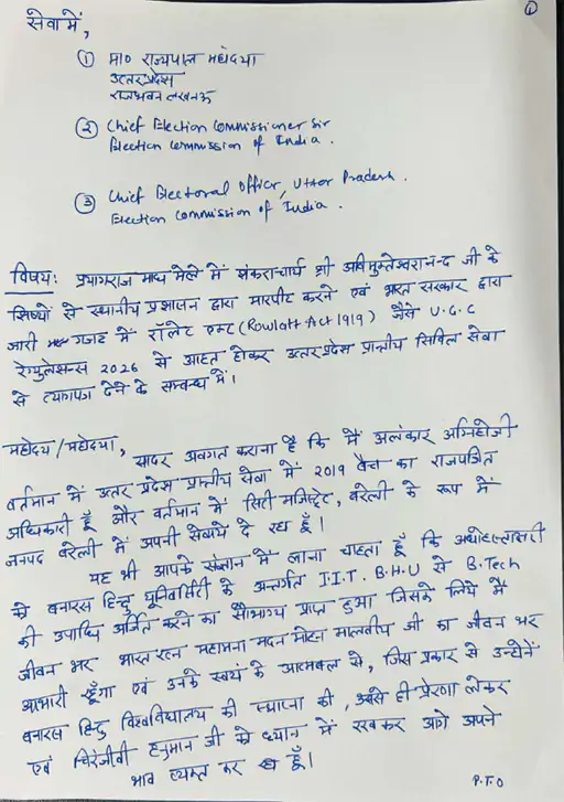 मैं शंकराचार्य अविमुक्तेश्वरानंद जी के शिष्यों के साथ प्रशासन द्वारा की गई मारपीट और भारत सरकार के नए कानून UGC 2026 से दुखी होकर सिटी मजिस्ट्रेट के पद से इस्तीफा दे रहा हूं। मेरा नाम अलंकार अग्निहोत्री है। मैं 2019 बैच का पीसीएस अधिकारी हूं। अभी बरेली में सिटी मजिस्ट्रेट के पद पर तैनात हूं।