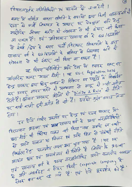 इससे ऐसा लगता है कि प्रशासन और मौजूदा सरकार ब्राह्मणों और साधु-संतों के खिलाफ सोच के साथ काम कर रहे हैं। उनकी इज्जत के साथ खिलवाड़ हो रहा है। 13 जनवरी 2026 को यूजीसी ने एक नया नियम जारी किया।