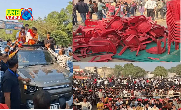इटावा : मृदुल तिवारी 12 मिनट में वापस लौटे, भीड़ बेकाबू; बैरिकेडिंग, स्टेज और कुर्सियां तोड़ीं
