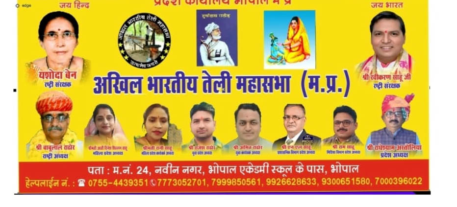 भोपाल — राधेलाल साहू, भारत में तेली साहू राठौर समाज की एकता, विकास और संगठन विस्तार के लिए निरंतर कार्यरत अखिल भारतीय तेली महासभा ने मध्य प्रदेश में एक और बड़ी उपलब्धि अपने नाम की है। संगठन का प्रदेश कार्यालय भोपाल में विधिवत रूप से उद्घाटित किया गया।