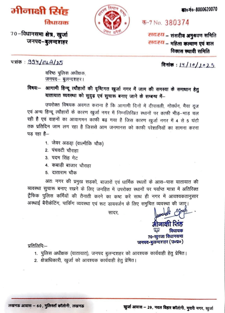 खुर्जा : जाम की समस्या को निजात के लिए विधायक मीनाक्षी सिंह ने एसएसपी को लिखा पत्र