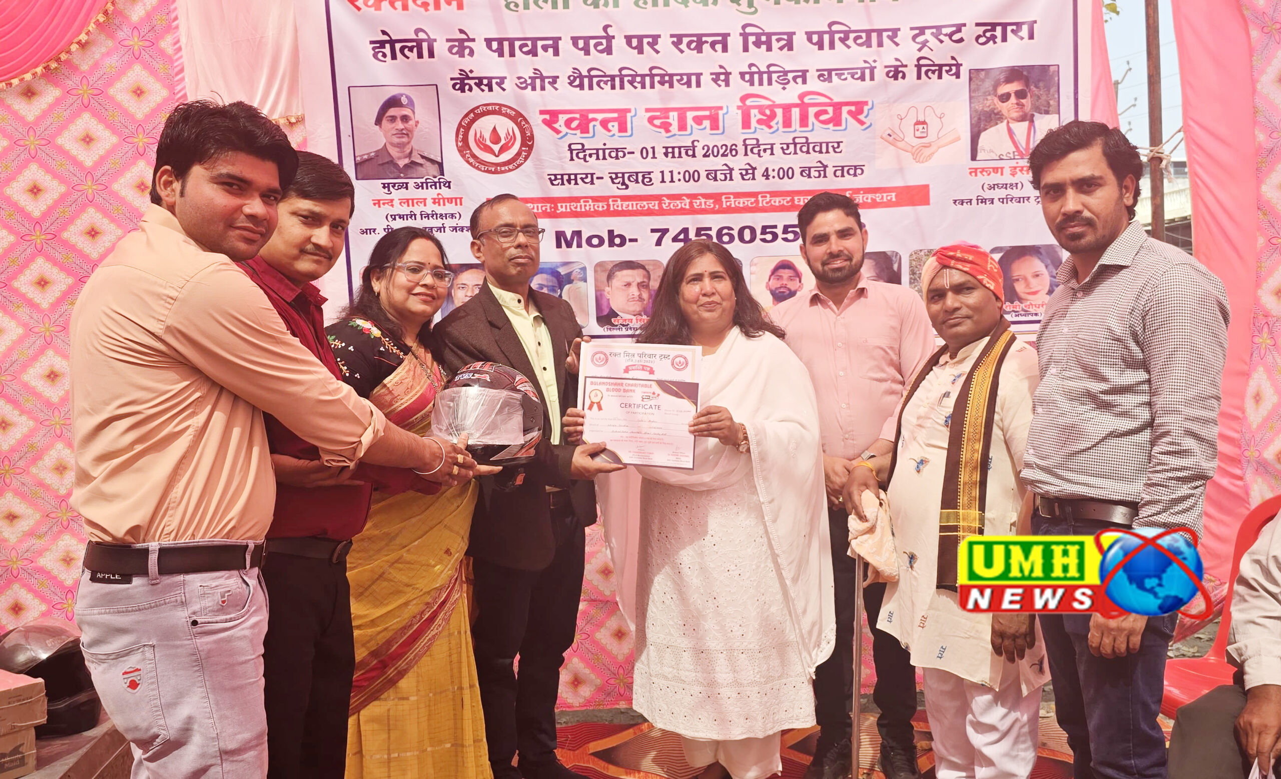 रक्तदान शिविर में रेलवे के कर्मचारियों और महिलाओं ने बढ़.चढ़कर हिस्सा लिया रक्तदान किया रक्त दाताओं को हेलमेट भी दिए गए रक्त मित्र परिवार ट्रस्ट द्वारा निशुल्क एंबुलेंस सेवा भी चलाई जाती है तरुण इंसा ; अध्यक्ष द्ध सुधीर राघव ;सचिव द्ध पवन भैया जी ;कोषाध्यक्ष द्ध विष्णु ; उपाध्यक्ष द्ध संजय सिंह ; दिल्ली प्रदेश अध्यक्ष द्ध धनेश राघव ;अध्यापक द्ध रोमी चौधरी ; अध्यापक द्ध आचार्य श्रीमेघदत्त शर्मा ष्शास्त्रीजीष्