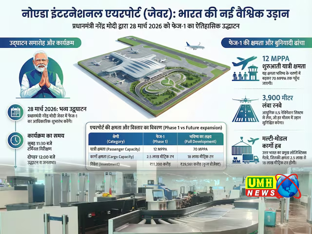 - पैसेंजर कैपेसिटी: पहले चरण में यह एयरपोर्ट सालाना 12 मिलियन (1.2 करोड़) यात्रियों को संभाल सकेगा.