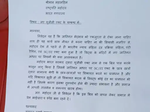 बुलंदशहर के खुर्जा में गुरुवार को स्वर्ण समाज के लोगों ने यूजीसी के विरोध में प्रदर्शन किया। वे जिलाधिकारी (डीएम) को ज्ञापन सौंपने जा रहे थे, लेकिन पुलिस ने उन्हें रोक दिया। इसके बाद, प्रदर्शनकारियों ने राष्ट्रपति को संबोधित एक ज्ञापन पुलिस अधिकारियों को सौंपा।