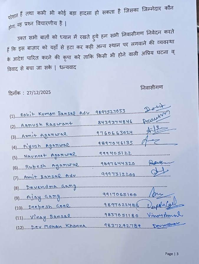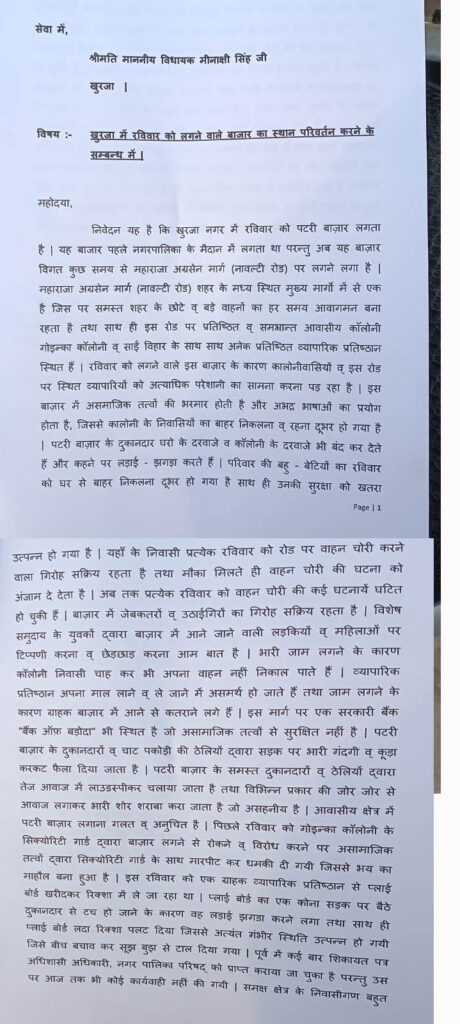 खुर्जा व्यापारी सुरक्षा फोरम की तरफ से नगर के स्थानिय लोगों और व्यापारियों की समस्याओं को देखते हुए एक ज्ञापन खुर्जा विधायक मीनाक्षी सिंह को दिया गया है। जिसमें कहां गया कि स्थानिय लोगों को वाहन लेकर निकलना दूभर हो गया है। तो वही असमाजिक तत्व के लोग बहन-बेटियो को देखकर अभद्र व्यवहार करते है। स्थानिय दुकानों के बाहर जबरन सामान रखकर बेकना शुरू कर देते है। विरोध करने पर मार-पिटाई पर उतारू हो जाते है। खुर्जा के नावल्टी रोड़ जो शहर के मुख्य मार्गो से जोड़ता है। वहां सड़क पर अवैध् रूप् से कब्जा कर मार्केट लगाई जाती है। लोगो का वाहन लेकर अपने घरो तक जाना मुसिबत बन गया है।