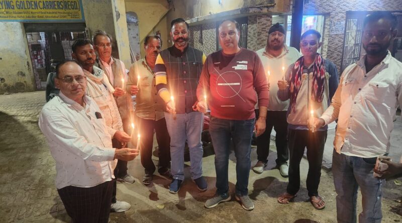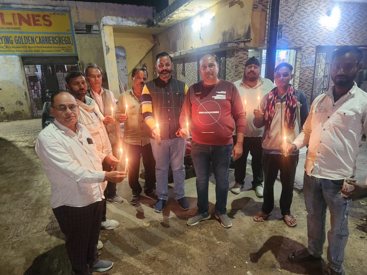 खुर्जा। खुर्जा ट्रांसपोर्ट एसोसिएशन के सदस्यों ने दिल्ली लाल किला पर हुए सोमवार को बॉम्ब ब्लास्ट में दिवंगत आत्माओं के लिए केंडिल जलाकर दो मिनट का मौन रखा गया।