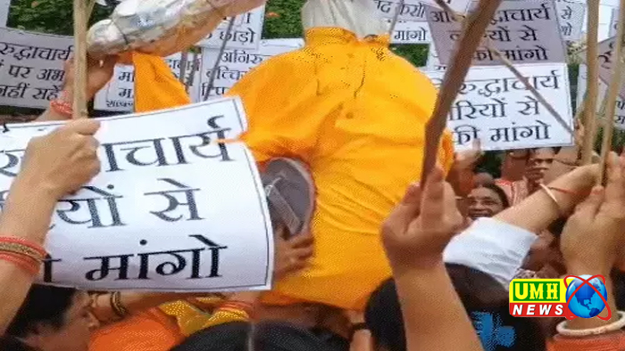 वाराणसी : अनिरुद्धाचार्य के पुतले पर महिलाओं ने बरसाईं चप्पलें
